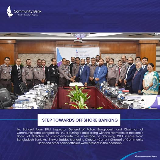 Mr. Baharul Alam BPM, Inspector General of Police, Bangladesh and Chairman of Community Bank Bangladesh PLC. is cutting a cake along with the members of the Bank’s Board of Directors to commemorate the milestone of obtaining OBU license from Bangladesh Bank. Mr. Kimiwa Saddat, Managing Director (Current Charge) of Community Bank and other senior officials were present in the occasion.